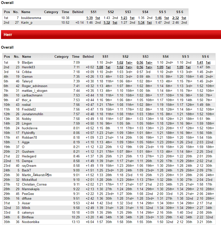 MickeMud sa:Stort tack Jonatan för kanonkul rejs, rigtigt bra alla sträckor. Hade man bara tagit sig tiden att provköra dom i tid innan hade det säkert gått bättre resultatmässigt. Hann prova 2&3 en vända och skulle gena ut från parkeringen och slet upp en 3cm reva i bakdäcket mot en vass stenkant, poff så va jag och cykeln sprutlackade av punka vätska. Låna däck jakten tog vid och blev snabbt medveten hur ute man är med 27,5....du det är 2018 nu blev jag upplyst om ?