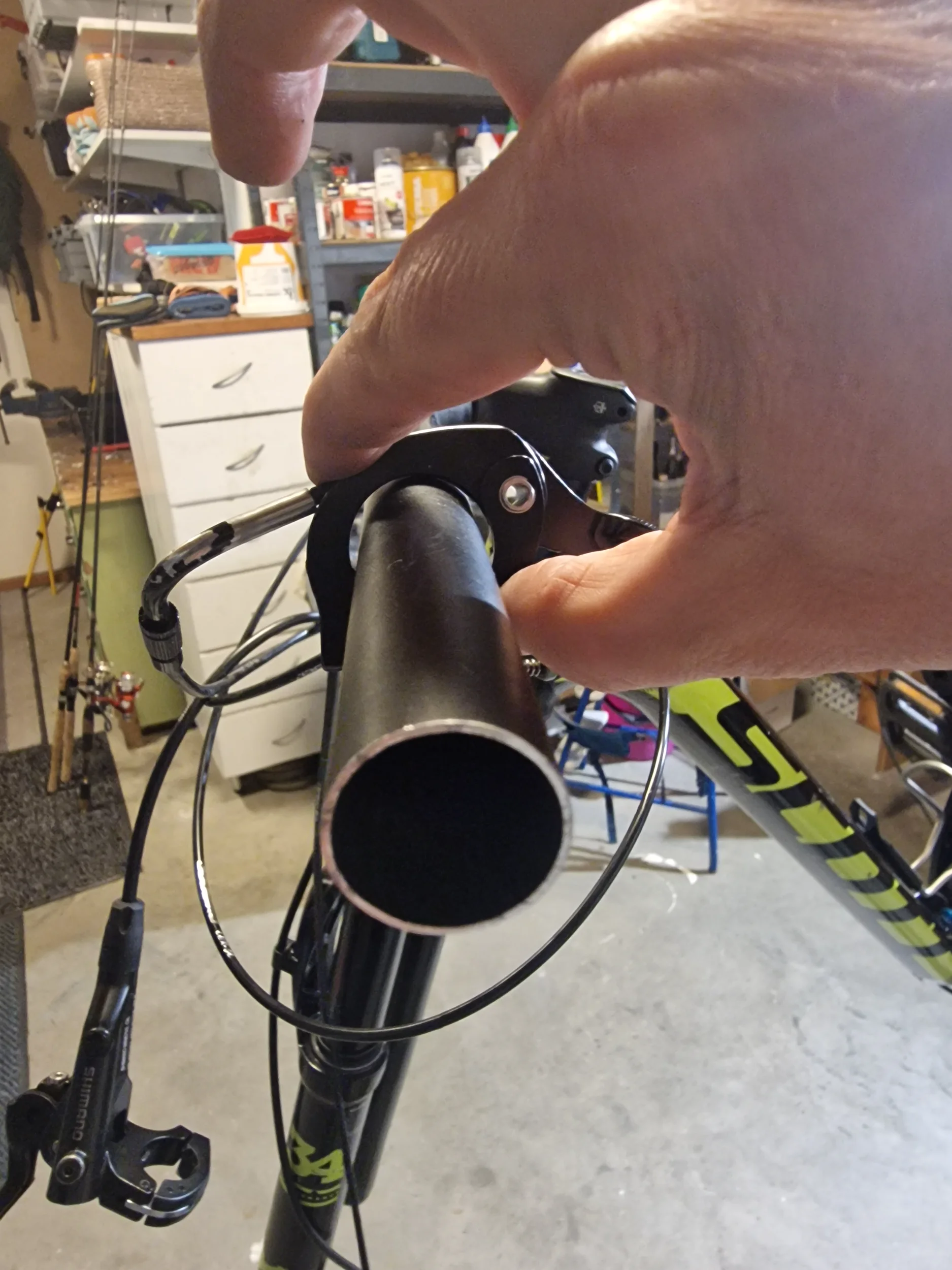 Varför komplicera något på detta sätt? Helt onödigt. En klassisk clamp hade löst problemet som man har på bromsar och växelhandtag.