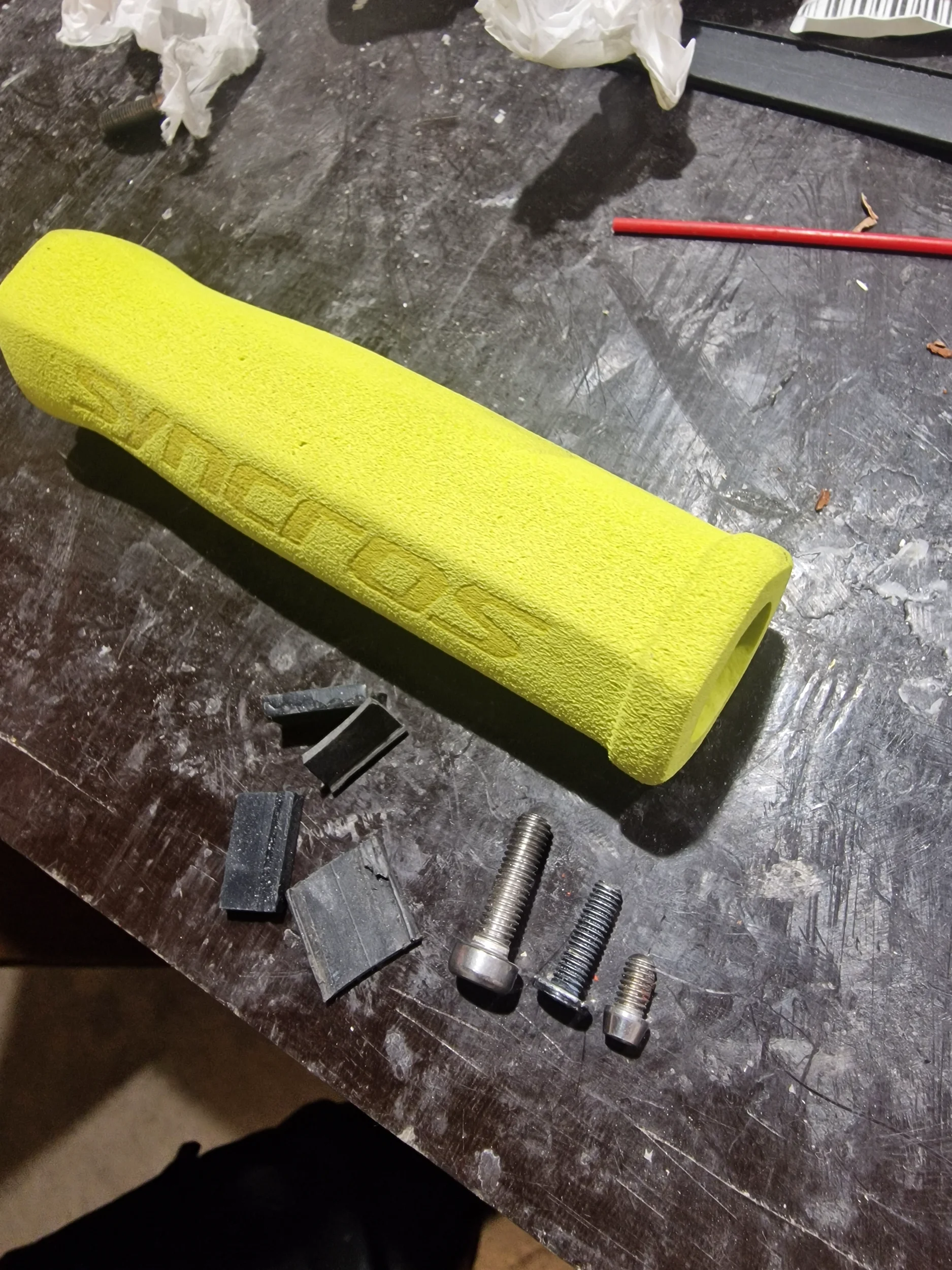 De ligger på nån tipp redan... Men Ok, ska testa med nåt hårdare material än gummi. Inbillade mig att Syncros handtagen jag köpt skulle fungera, men riktigt så lätt var ju inte det här.