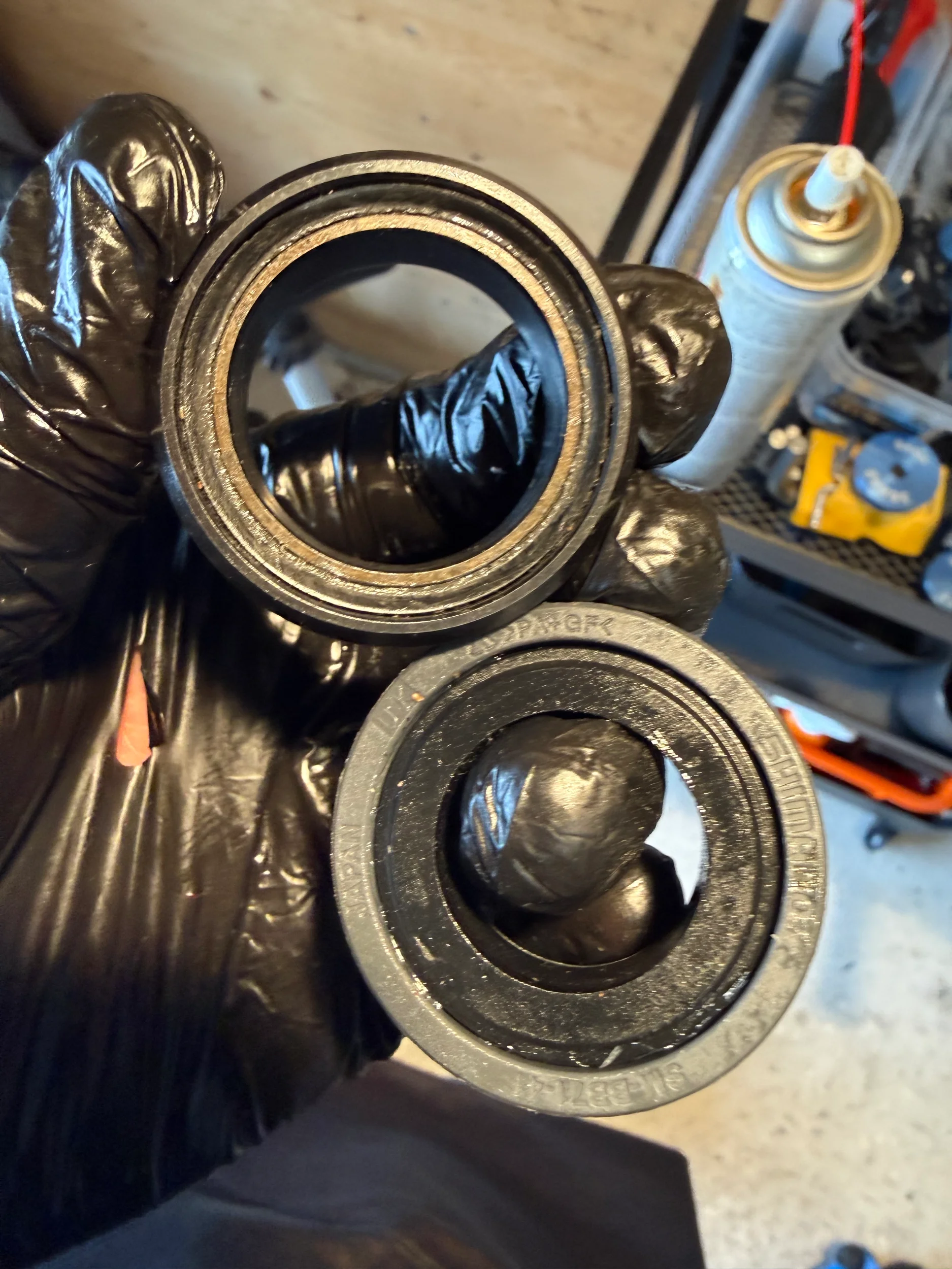 Jag inbillar mig att de skall vara i den axeln som håller bak triangeln kopplad till ramen(mot lagren). Men det känns som att det blir för "tight" när jag justerar in allt. Eller så är inte lagren pressade hela vägen..