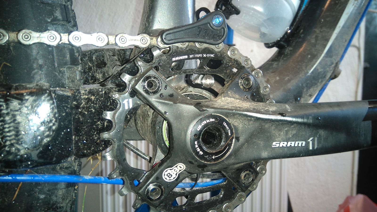 Original sitter sram xsync, jag nötte ut min och köpte en ny fast i stål. Sen har jag precis köpt en 77design styrare å taco istf original;-)