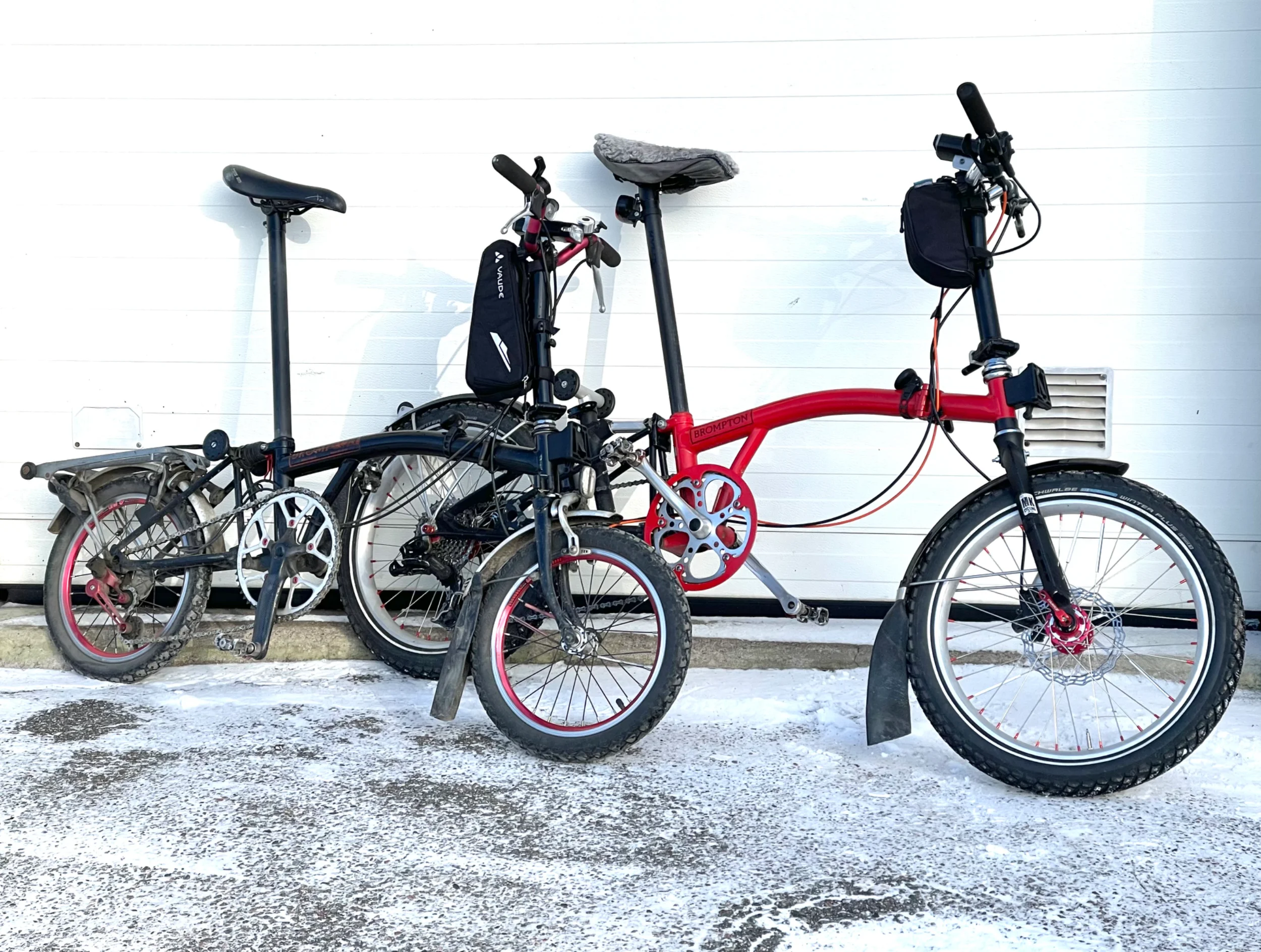 men den har avgörande fördelar på vintrigt underlag; 406 dubbdäcken är där klart bättre än 349. alltså det är inte direkt storleken som är problemet, utan att just 349 dubbade schwalbe är glädjedödande trögrullande, det är dessutom trångt under skärmarna, och växlarna riskerar frysa igen. det finns bot mot detta, men det är något man måste förhålla sig till.