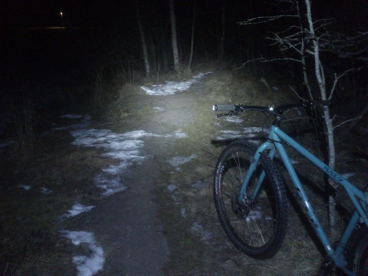 Blev tvungen att prova det här med lampcykling. Varierande underlag i närområdet, från fint trampad vinterstig till nästan sommarväglag med lite blankis emellan.