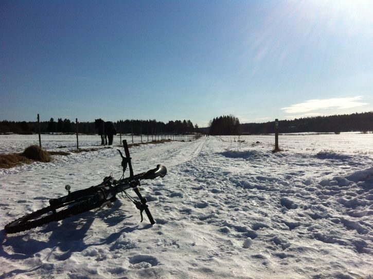 Blev visst en tur idag igen. Inte speciellt svårt att övertyga sig själv när solen strålar och minnet från gårdagens grymma cykeltur är färskt i minnet. Tog ett tag att få igång benen som var lite sega. Betydligt halare idag, inte för att jag vurpade eller tappade någon spång men några gånger var det lite väl spännande med långa framhjulssläpp. Kanterna i spåret in mot torpet är hårda så är det is kan man lägga framhjulet lite vid sidan om utan att tappa fart. Torpet tor Alsike är snabbt och lite rodelbana. Massa studenter eller liknande var ute och testade friluftsliv. De var rätt schyssta och gick åt sidan när de släppte förbi farbror.