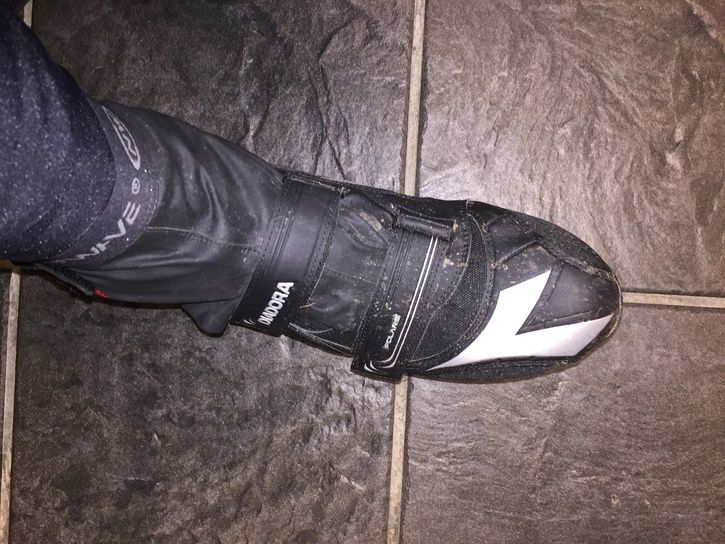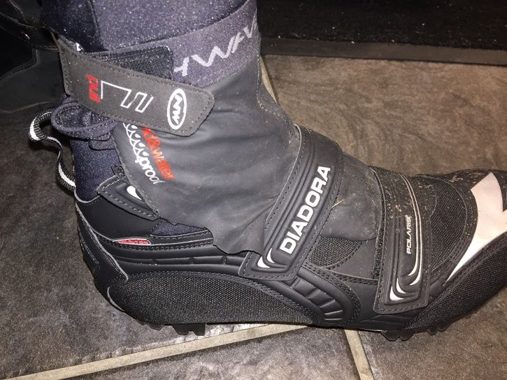 Moddade Polarex då plösen suger vatten. Gamla Northwave skoskydd som klippts ner till plös och som knäpps runt vristen