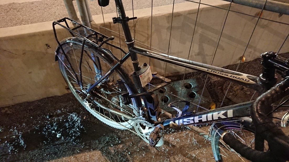 Jag kan tillägga att ägaren faktiskt har ansträngt sig för att få behålla cykeln genom att använda dubbla lås. Bakhjulet var fastlåst i ett likadant metallstag med ett vajerlås runt bakfälg/däck, skärm och pakethållare.