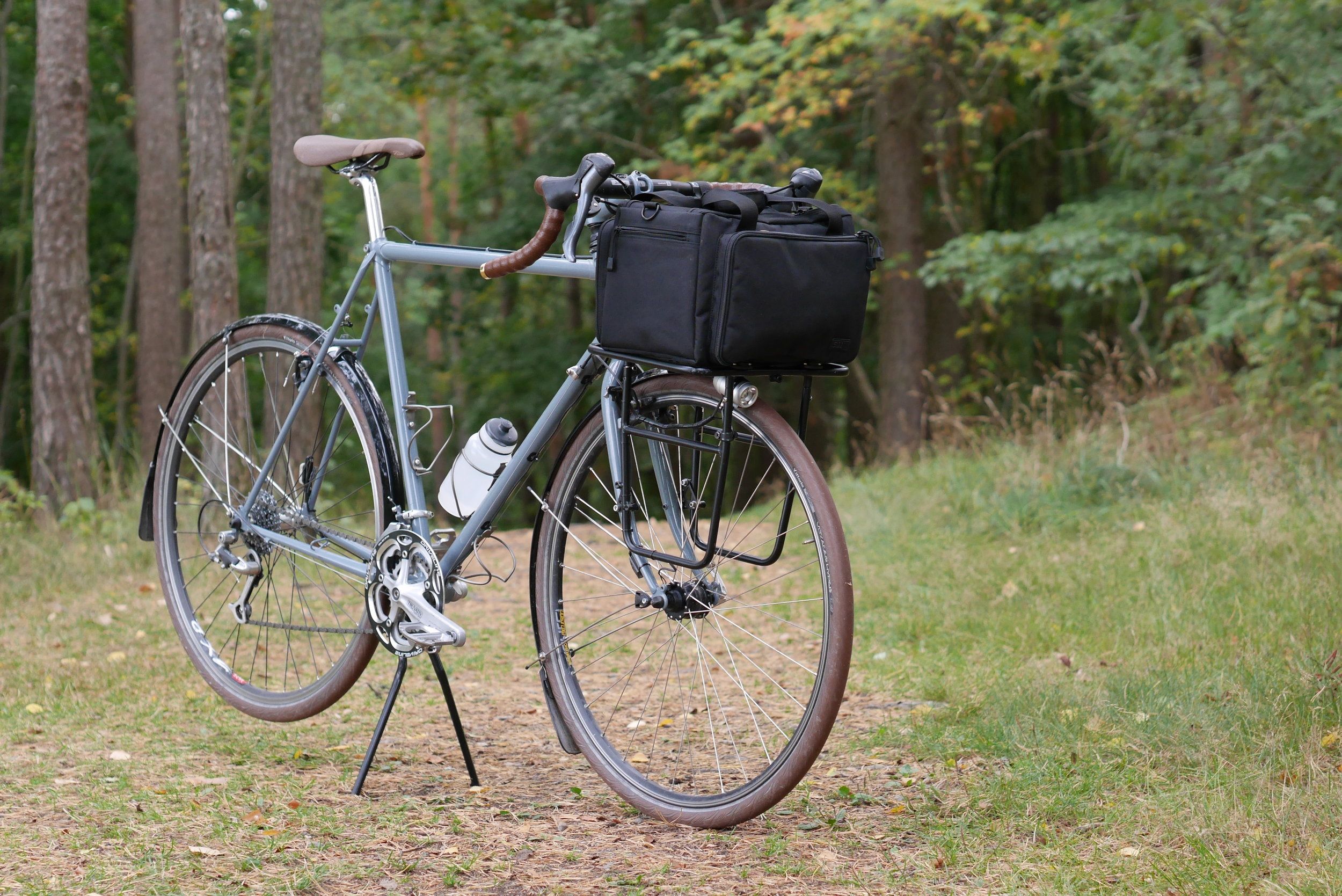Cykeln vid avfärd. Drygt 4l vatten på cykeln, 5l i vardera väskan och blandad friluftsutrustning i hållarna på gaffeln.