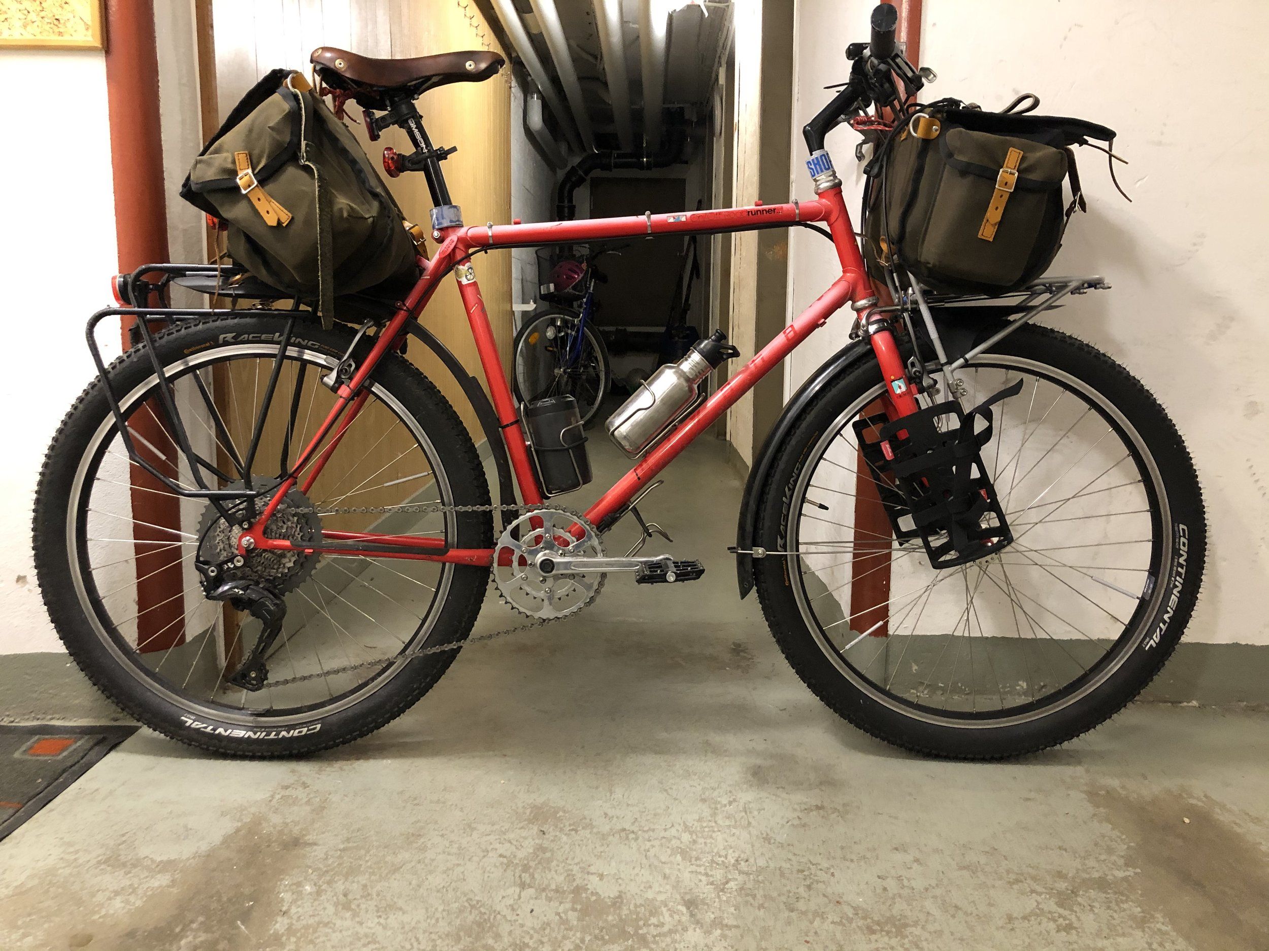 Jag har som ni vet byggt Norrskensflamman främst för pendling men också med potential för smutstouring. I väntan på att lbs ska få hem skärmar och lite annat så har jag roat mig med att testa ”packbarheten” på cykeln genom att lusa ned den med väskor, pakethållare och först två Salsa Anything Cages på gaffelbenen och därefter, i ett skov av Bolt on Mania, ytterligare två bak på pakethållaren.