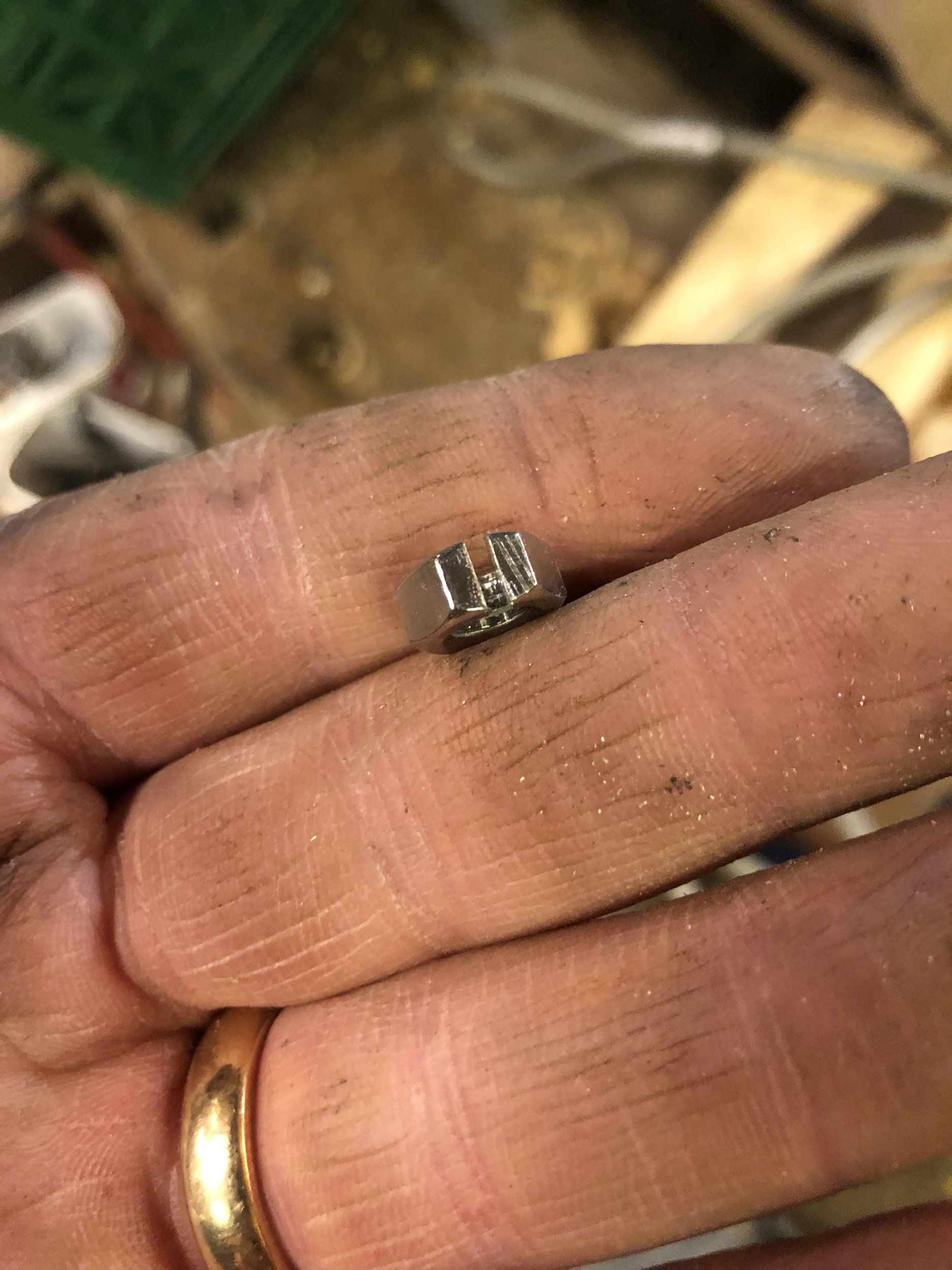 Återstod därför att trolla. En M6-mutter lades på operationsbordet - vilket i casa LWB som av en händelse gör dubbel tjänst som obduktionsbord - och slitsades med bågfil: