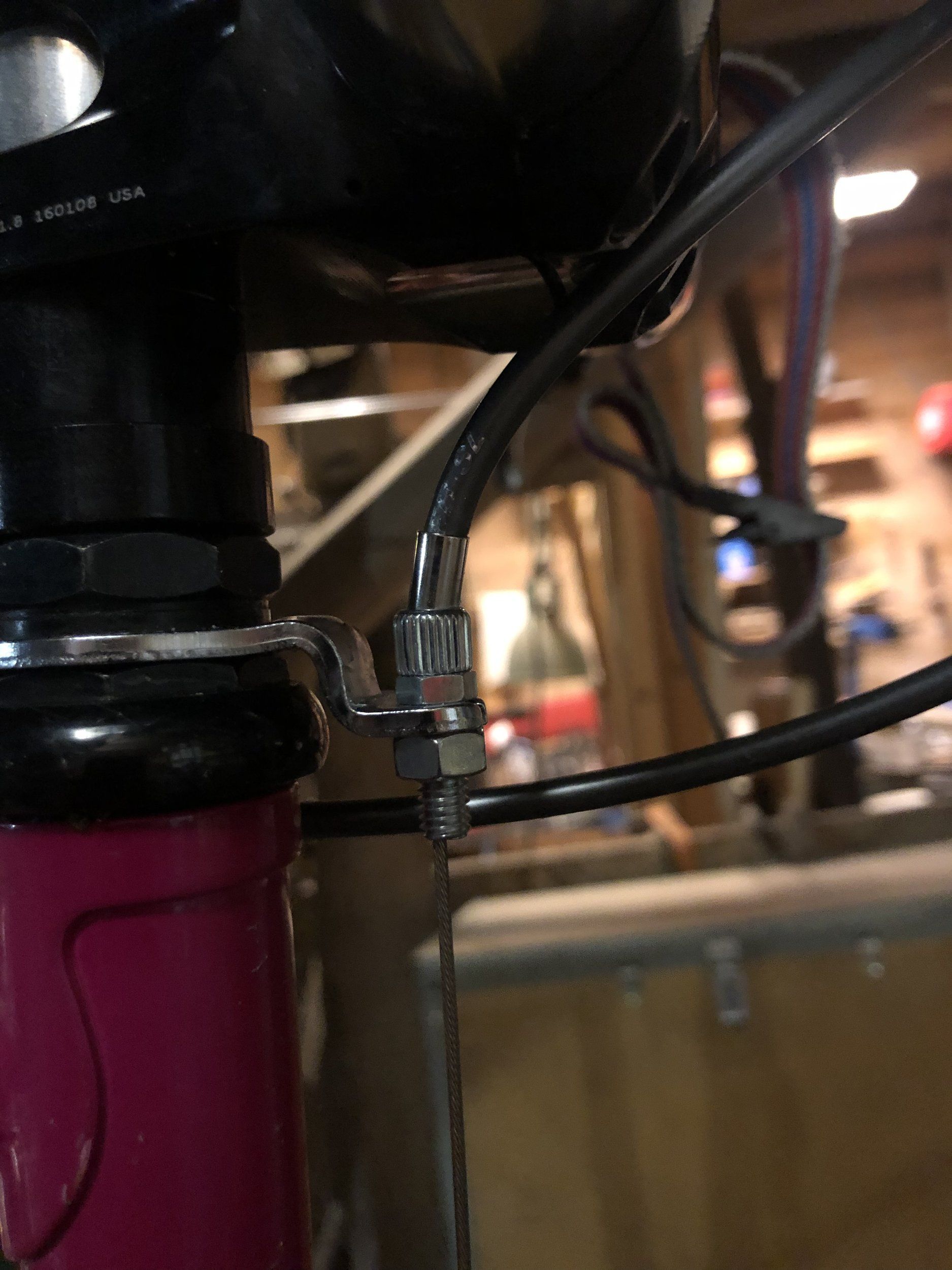 …så kan man tänka sig ett antal olika lösningar utöver att låta det vara, hålla näbben och cykla. En kunde vara att höja stammen så att höljet fick en snällare krök. En annan vore att styra vajern genom en v-bromsnudel. En tredje kunde vara att tvinga justerskruven till rättning i ledet genom att sätta en mutter även på undersidan av stoppet.