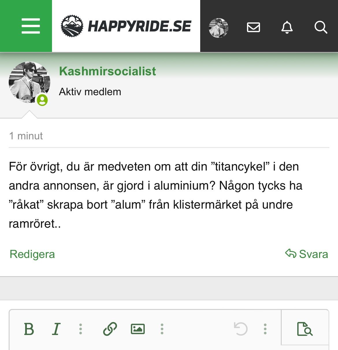 Det tråkiga i sammanhanget är när folk som inte bidrar till diskussionerna utan skrupler och med rymligt samvete försöker kapitalisera på vad tråden har skapat. De kan för mitt vidkommande använda sina fantasi-Miyata som passbit i den sista lilla glipa som läcker härskna gaser ur deras alldeles för tajt justerade baknav. Ramarna passar i den tillämpningen bäst på tvären har jag hört.