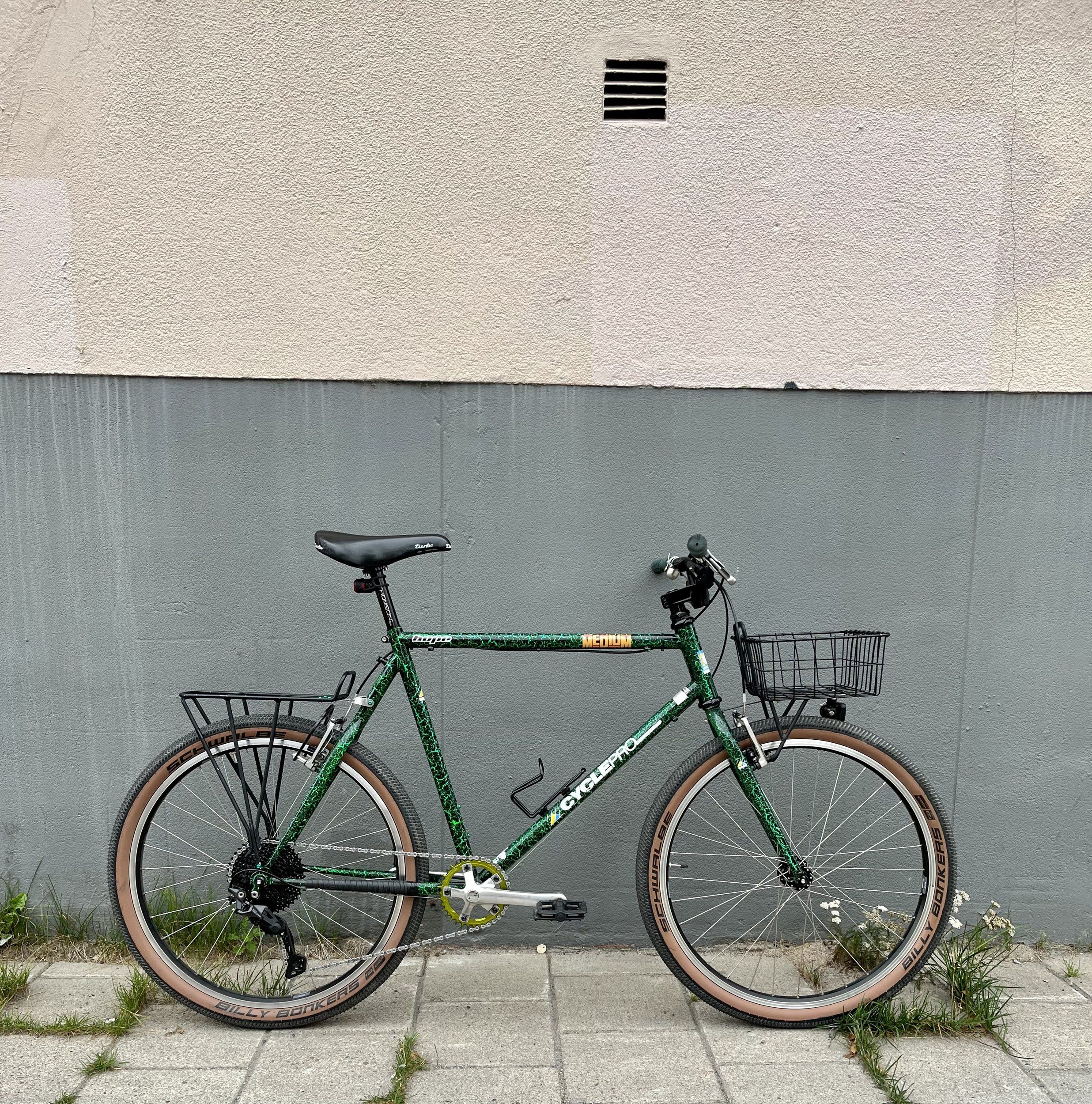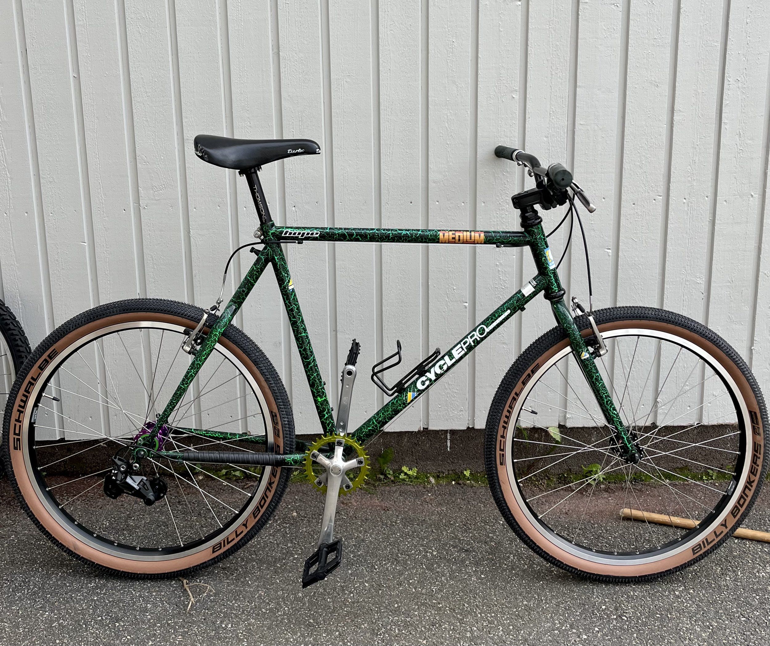 Ram och gaffel: Miyata TrailRunner från 1990. Alu i huvudtriangel och cr-mo i baktriangel och gaffel.
