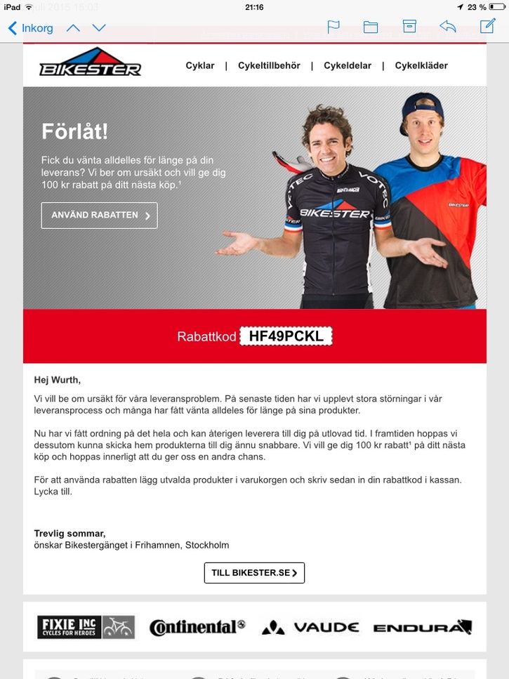 "Någon som vill referera mig på Wiggle? Ska just lägga en order på 660 spänn och såg att de har en "refer a friend" grej på siten. Jag får ett par glasögon och den som referat får 10% av det jag handlat för, så bara 60 spänn, men alltid något. Man måste ha handlat innan för att få nyttja erbjudandet."