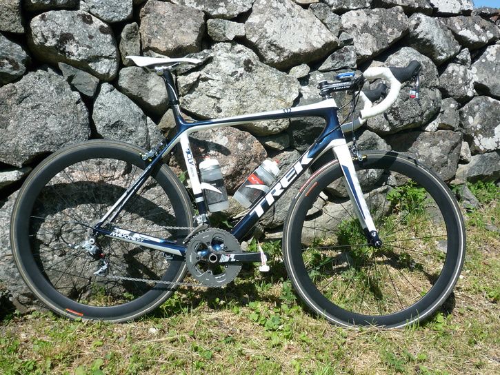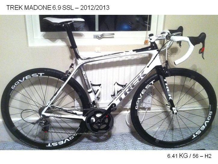 TREK MADONE 5,9 årets modell, ramen tillverkad i Tyskland. Med SRAM RED komponenter, KMC kedja, Token carbon styre. Ritchey WSC styrstam, sadel Bontrager, hjulen med BHS nav, KN MAC 424 ekrar och fälgar 49mm tub från X-Bike Equipment. Vikt 6410g.