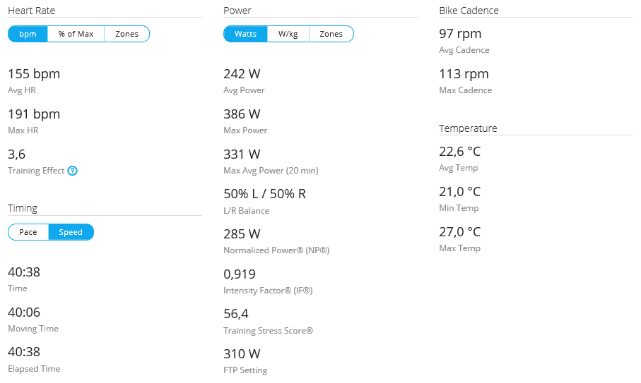 Vikt inför passet var 73.5 kg, så 4.08 W/kg.