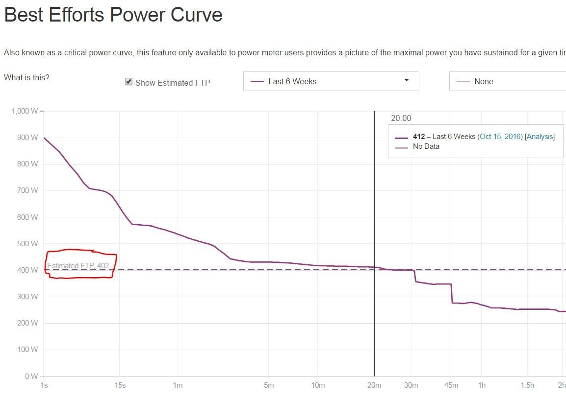 Kanske använder den lutningen på CP-kurvan och extrapolerar till en timme utifrån nån fysiologiskt baserad formel? Om spannet mellan 20 och 40 min faller av bara lite, så kanske Strava räknar med att det bara faller av lite till upp till en timme. Men är fallet större där så blir värdet lägre.