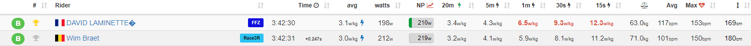 Tror att två vassaste klass B åkarna i Zwiftlaget jag kör för ibland är dessa två herrarna (båda dock 50+), du slår båda i spurtstyrka, de väger 93 respektive 99 kg. Det som brukar imponera mig med dessa båda är att de brukar klara av även tuffa kuperade banor utan större bekymmer som varar runt ca 60 minuter varje fall. Arwel misstänker jag kan vara runt 60 bast men inte helt hundra.