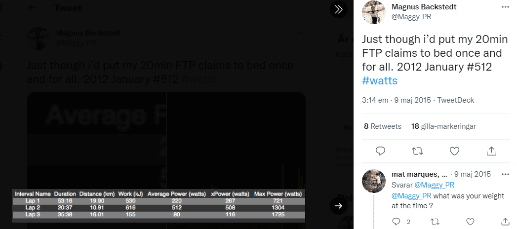 Hans max registrerade maxpuls var 177 nån sida tillbaka där. Det står 281W ftp och 71 kg i hans bio. Men lite konstigt för längre ner står det att det bästa han gjort på 20min är 4,4w/W/kg. Kollar man några sidor tillbaka så har han haft 4,9w/kg på 20min år 2020. Det står också att hans kategori är A. Men han verkar aldrig köra några tävlingar dock. Alla turer verkar vara träning.