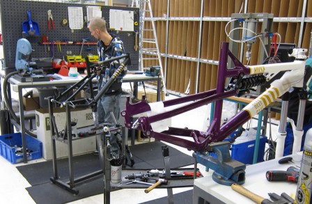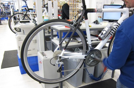 Samtidigt plockas övriga komponenter ihop till cykeln. Cykelavdelningen har ett speciellt lager enbart avsett för cykelmontering. Hjulen byggs ihop, riktas och däcken monteras.