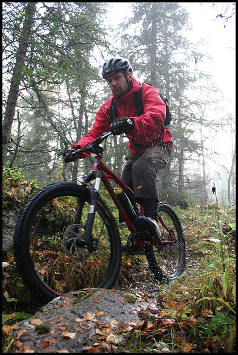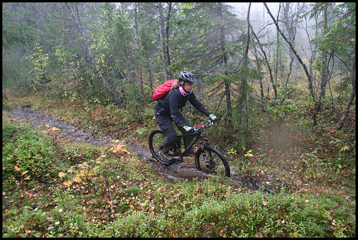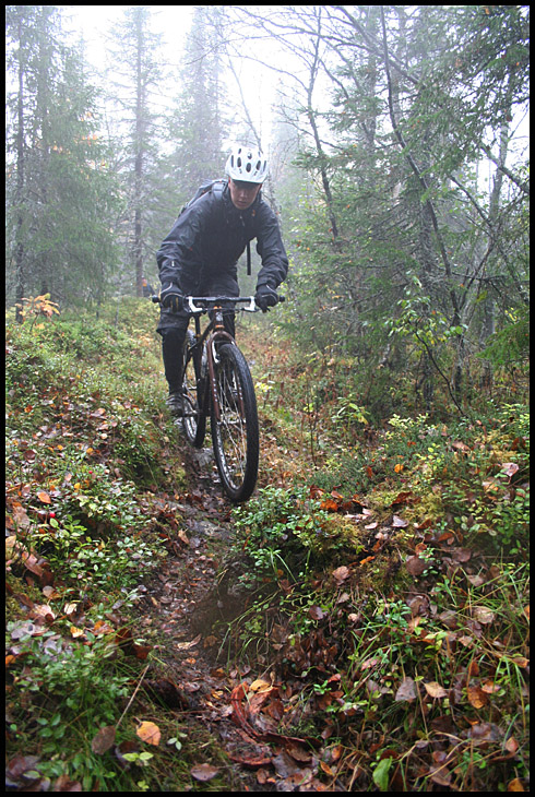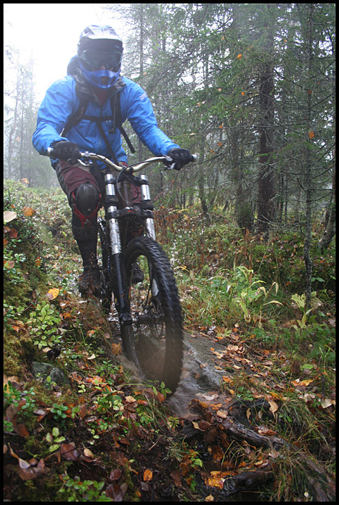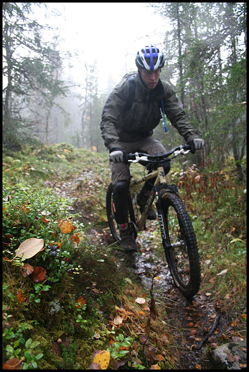 En bit ner började fjällbjörkskogen att rama in stigen och det blev betydligt blötare och halare underlag. Mattel tar sig an en av de mer slippriga utförlöporna…
