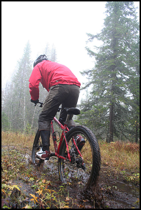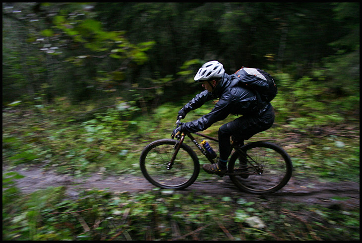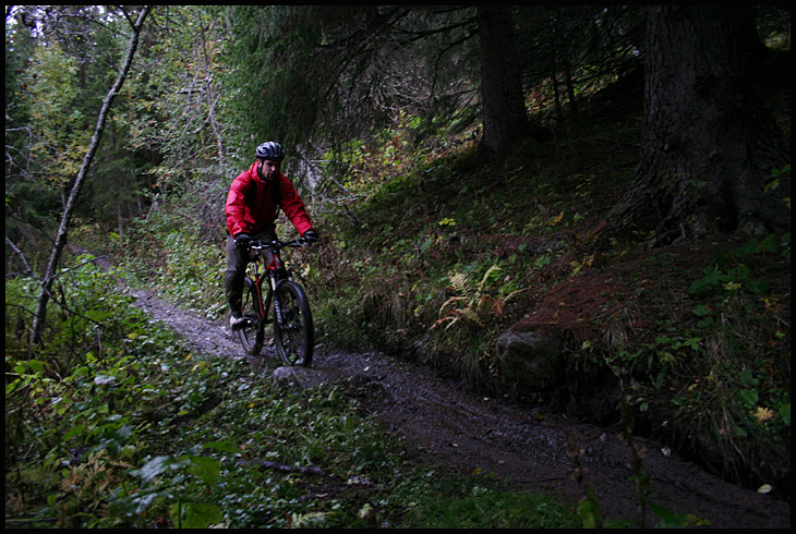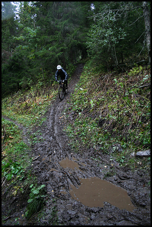 När vi väl kommit bort till Bräckeleden blåste det upp och började regna alltmer entusiastisk och vi kastade oss nerför denna nu smetiga och slingriga utförslöpa. Man fick onekligen navigera med tungan rätt i mun för den annars så snabba, slingriga och lycko-roliga utförslöpan var nu dessutom hal, slipprig, rotig och allmänt som såpad i det allt tilltagande regnet. Allteftersom svängarna och branterna passerades så fick i alla fall undertecknad ett allt bredare storleende i sitt smutsiga anlete, det var hur kul som helst i kletet och det gjorde inget att det inte gick speciellt fort heller. Vi tråcklade oss neråt med kasande däck i leriga spår och djupa pölar.