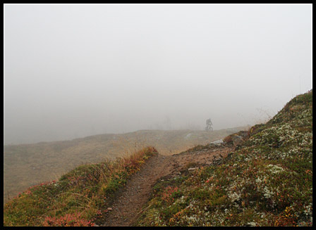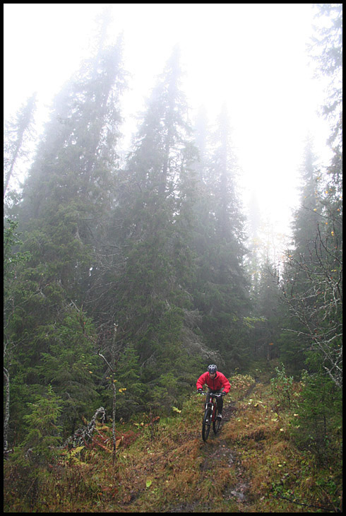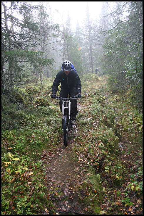 Väl ute på stigen igen så fick vi surfa utför en snirklig, snabb och stökig stig genom dimman på fjället. Egil lyste blått som riktmärke framför oss hela tiden…