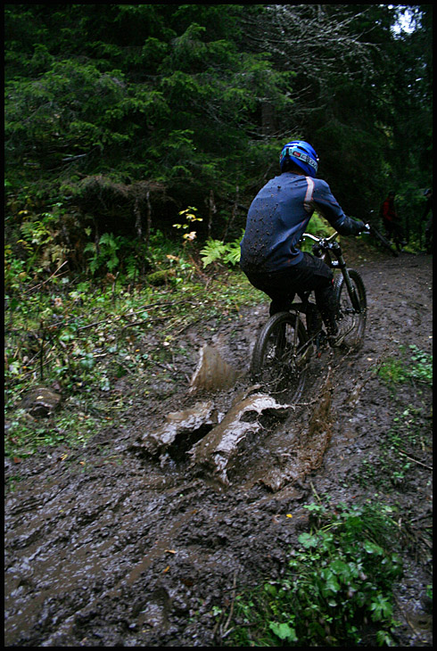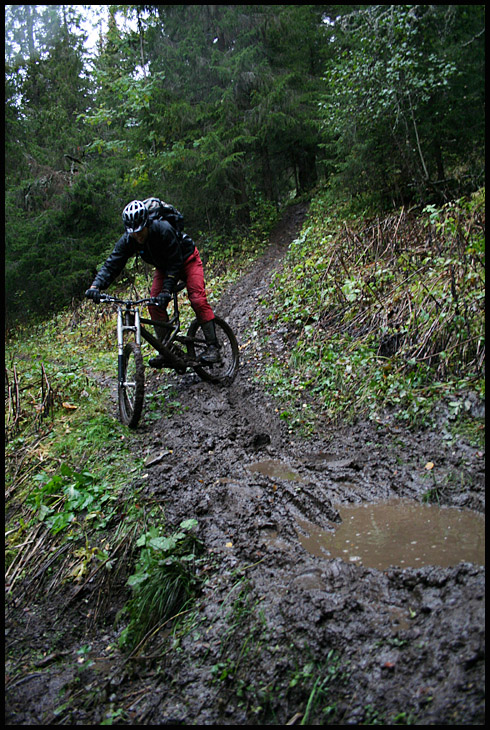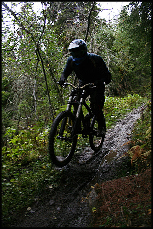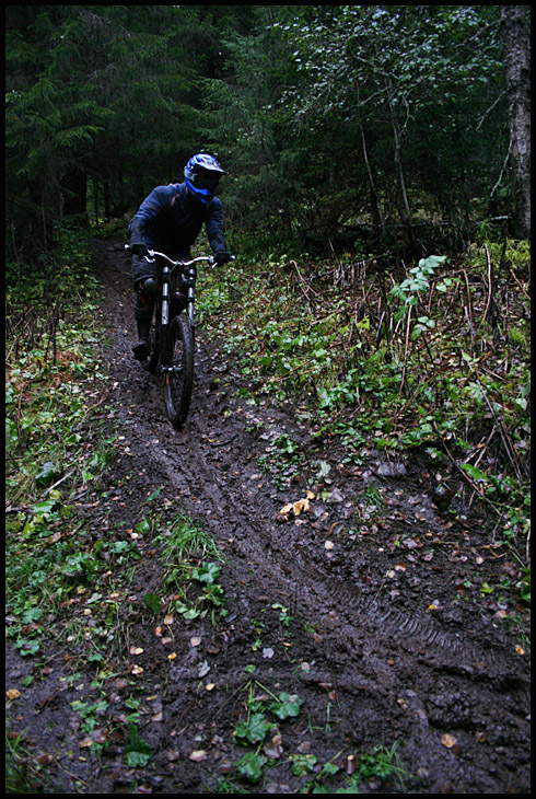Det var en av de mer minnesvärda åken på Bräckeleden för undertecknad och det var faktiskt enormt skojigt att köra den under sådana här förhållanden. Dessutom fick väder, underlag och utrustning oss att köra betydligt lungnare än vad man brukar göra när man sitter på sin DH-släde i fullt säkerhetskitt, vilket gjorde sitt till att man njöta av stigens utmaningar på ett lite annat sätt än annars. Dessutom måste en enormt stor eloge gå till Christer Gullberg för alla de timmar han helt själv har lagt ner på Bräckeleden i sommar, de nya broar och omdragningarna gjorde den ännu bättre och roligare. Feta smetiga leriga tack Christer!