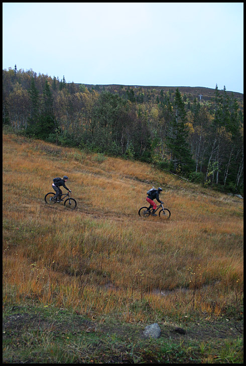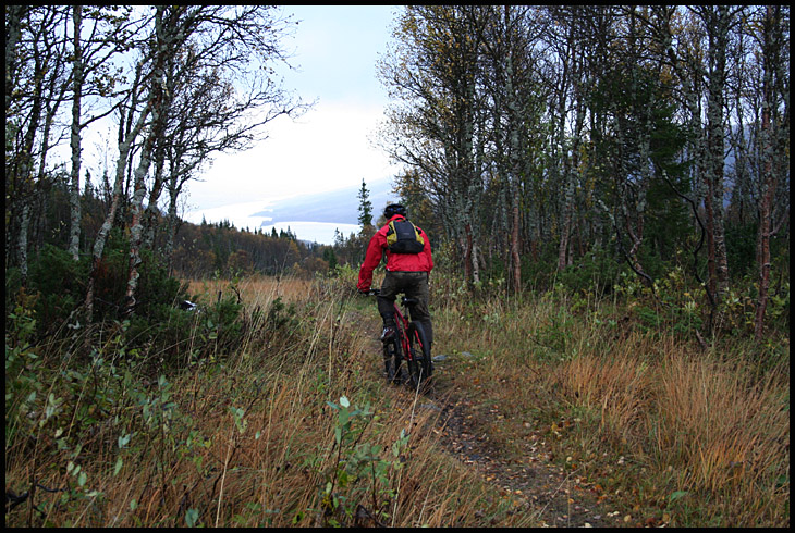 Efter en kortare släpning än väntat uppför från Ullådalen så hittade vi stigen och blev direkt inbjudna på en roligt slingrigt kuperad utförslek på skrå genom fjällbjörkskog och gräsängar. Det var flowigt och skojig åkning att njuta av och inte många tramptag behövdes för att hålla farten uppe. Mattel sveper förbi med Åresjön i fonden.
