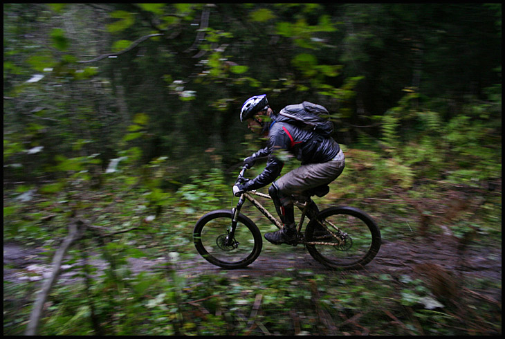 Boe låter sina stora hjul rulla på och hoppas att v-bromsarna ska vara tillräckligt effektiva i det blöta på berget…