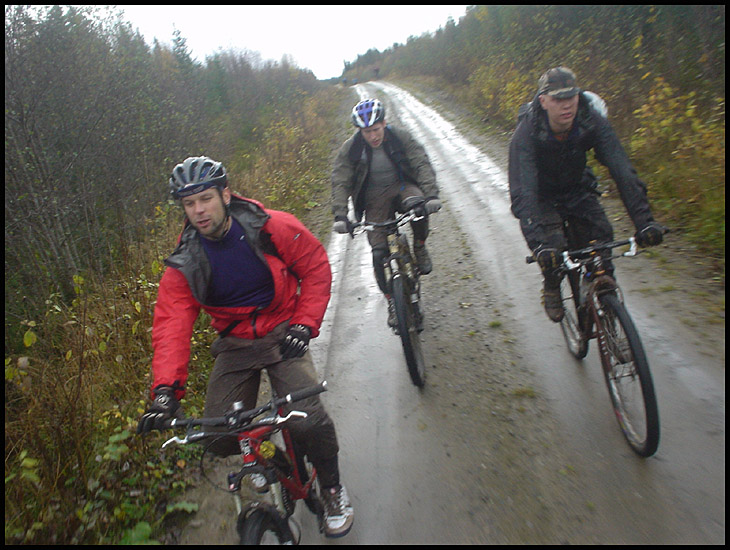 Efter den sedvanliga omklädning-packa-ryggan-få-med-sig-allt-viktigt-kaoset så satt vi snart i bussen på väg mot Åre. Väl där hittade vi Egil i full fart att sätta ihop sin hoj efter lite fulmekanisk service med ölburksspejsers i ett uttänjt styrrör, och nån timme senare rullade vi iväg i två bilar mot det utlovade stigäventyret. När vi anlände till vårt första stopp där vi skulle parkera den ena bilen så stod det givetvis en jaktskylt på grusvägen, men efter lite prat så bestämde vi oss för att köra ändå. Efter att ha dumpat egils bil så körde vi bussen vidare upp till Trillevallen där vi parkerade och började urlastning och uppklädning på en lersmetig parkeringsplats. Väl klara så började vi leda hojarna uppåt i dimman för första delen av dagens nöjen…