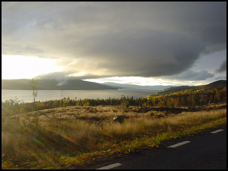 Vi packade in oss i bussen och drog iväg mot Kall för att packa ihop våra saker och röja ur stugan. När vi väl närmade oss stugan så klarnade det plötsligt upp och visade baksidan på Skutan i vackert höstigt ljus med dramatiska moln som fond, och det var bara för vackert.