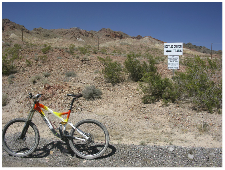 Boulder City ligger cirka 20 minuter sydost om Las Vegas och själva området där man cyklar kallas för Bootleg Canyon. Jag hade tagit med mig alla mina cykelattiraljer på flyget, så det ända jag behövde hyra i cykelaffären var en cykel. För att vara en sömnig stad med femtontusen invånare hade de en riktigt top-notch cykelaffär. Men det kanske blir lite saker över från Interbike som hålls här årligen… (I år är det i September.)