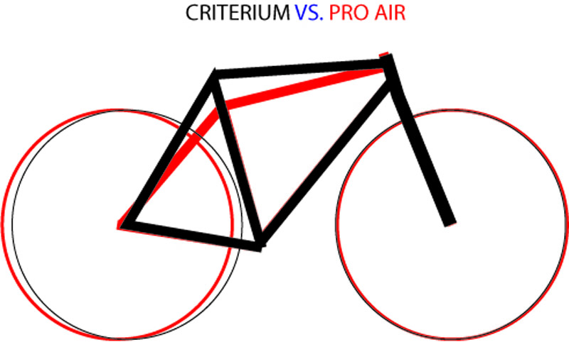 En noggrannare granskning av cyklarna visar att det är stor skillnad på ramarna. Criterium har en ganska klassisk racergeometri medan Pro Air har en geometri som är mer inriktad på ett lugnt och stabilt uppförande, även med tung last, och med möjligheter till extrautrustning som skärmar och bredare däck.
