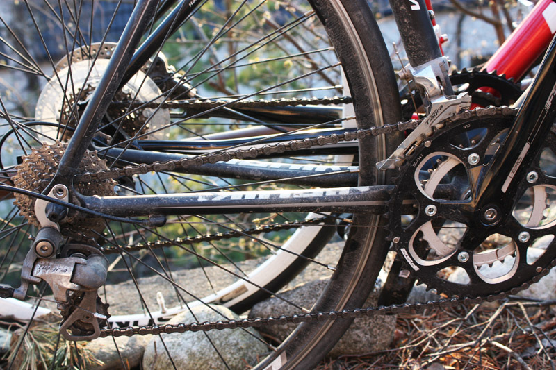 Om vi börjar med kedjestagen så kan vi konstatera att det är stor skillnad på cyklarna. Racern har 410 millimeter långa kedjestag, vilket är en ganska typisk längd för en racer. Hybriden har betydligt längre kedjestag med sina 440 millimeter. Kedjestagen begränsar däcksstorleken på racern, så bredare däck än 25 millimeter är svårt att få rum med. Det finns heller inte plats för skärmar. Hybriden däremot har gott om utrymme både för breda däck och skärmar.