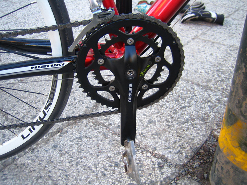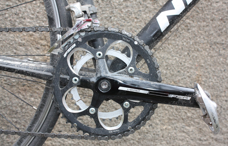 Vevpartiet är ett kompaktvevparti av modell FSA Vero. Kompaktvevpartier har mindre klingor jämfört med traditionella landsvägsvevpartier och möjliggör därför lättare lägsta växlar utan att det för den skulle behöver vara tre klingor fram eller en extra stor spridning på kassetten bak. Vevpartiet är ett budgetval från Nishikis sida, med helsmidda armar och vevlager med fyrkantsaxel. Den här tekniken var helt dominerande för femton år sedan men har i dag övergivits helt på bättre cyklar. Fördelen med dessa vevlager är att de har en lång livslängd, men de är tunga och ger vevpartier som inte är särskilt styva.