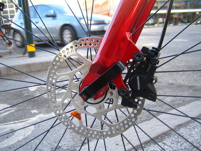 Bromsarna på racern är en enkel modell av vanliga racerbromsar från Tektro, som är något av ett no-name-märke i cykelvärlden. Hybriden har fått skivbromsar från Shimano av modell M446, som är en av Shimanos billigare hydrauliska skivbromsar. Att skivbromsen är hydraulisk innebär att tekniken något förenklat är samma som bromsarna på en bil eller motorcykel. Vid bromsreglaget sitter en bromscylinder, som pressar bromsvätska ut till bromsoken. Tekniken gör att det blir lägre motstånd jämfört med vajer och pålitliga bromsar som funkar i alla väder och kräver litet underhåll.