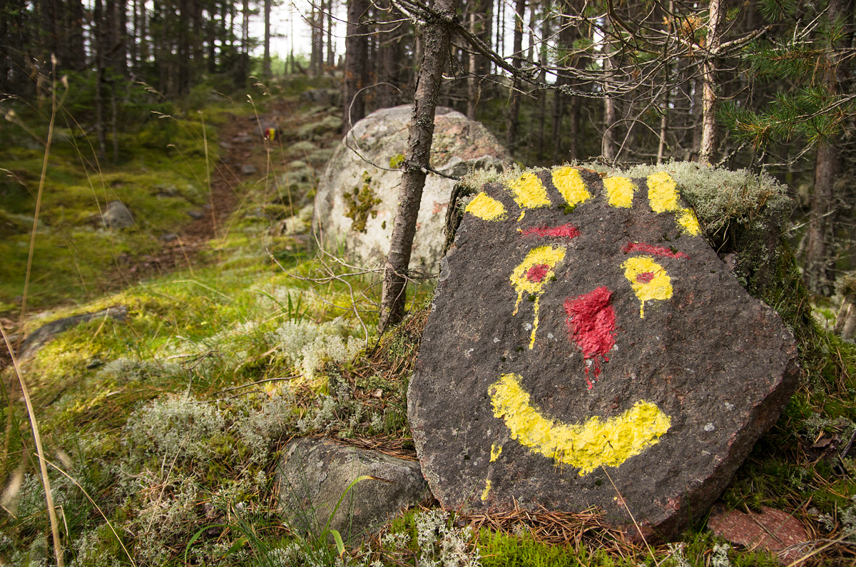 När det känns som slitigast uppför möts man då och då av små glada gubbar målade i de röda och gula färgerna som används för att markera stigen. De är säkert tänkta som uppmuntran, men det känns mer som ett hån.